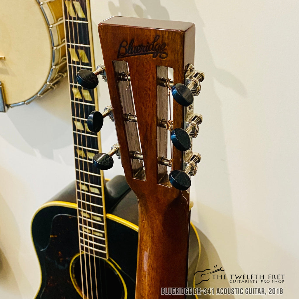 Here is a Blueridge BR-341 acoustic guitar from 2018 in Gloss. This model features a smooth, comfortable neck and a slightly smaller body that makes it easy to play for long sessions. The guitar produces a warm, clear tone with plenty of resonance, making it suitable for both fingerstyle and strumming.