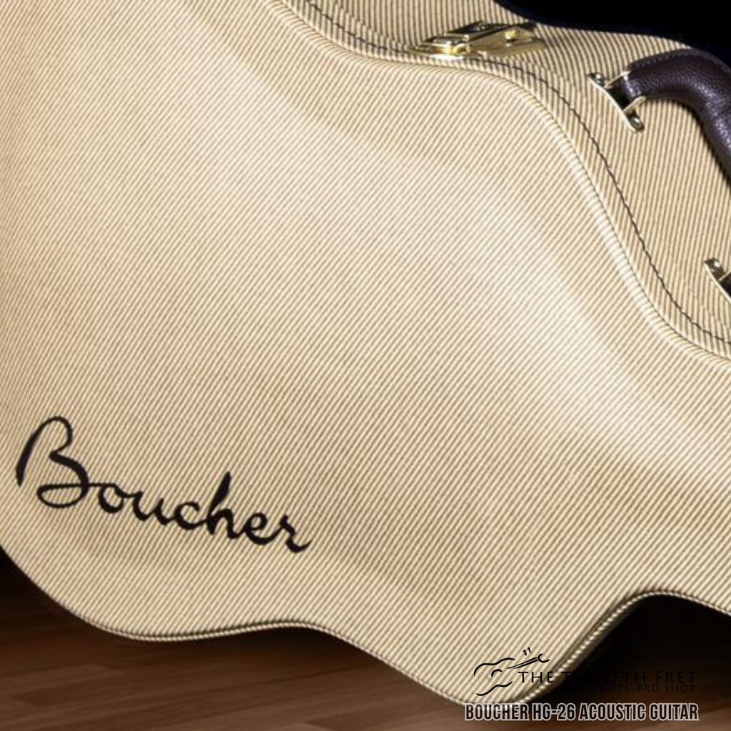 The Boucher HG-26 Acoustic guitar is a 000 body size that packs a punch featuring a hand selected torrefied AAAA Adirondack spruce top for a solid note fundamental and played in warmth. This guitar also features a lovely African Bubinga sides and back and comes with a tweed hardshell case.
