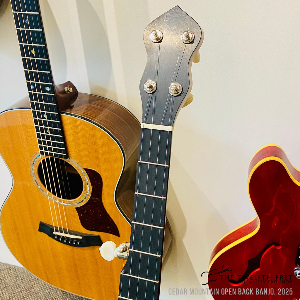 Here is a Cedar Mountain Open Back banjo from 2025. This banjo features an ebony fretboard with scoop and a Remo head.