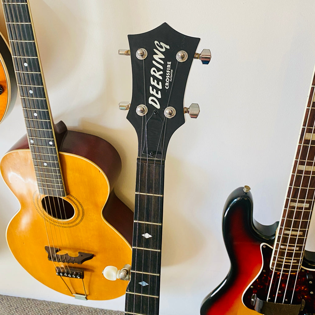 Here is a Deering Crossfire electric banjo in black finish, in good condition with original case included.