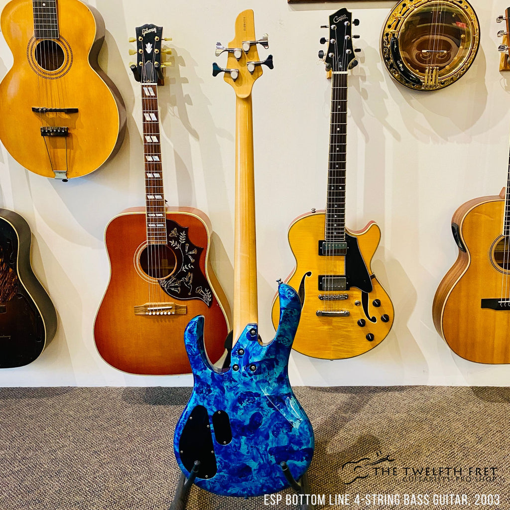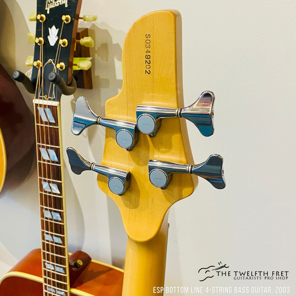 Here is a ESP Bottom Line 4-string Bass from 2003. This Japanese made bass features a cool Planet Blue gloss finish and active electronics to go along with the two single coil jazz style pickups. The maple neck has a comfortable C style profile and a rosewood fret board. As with all Japanese made ESP instruments the construction quality and fretwork is very good.