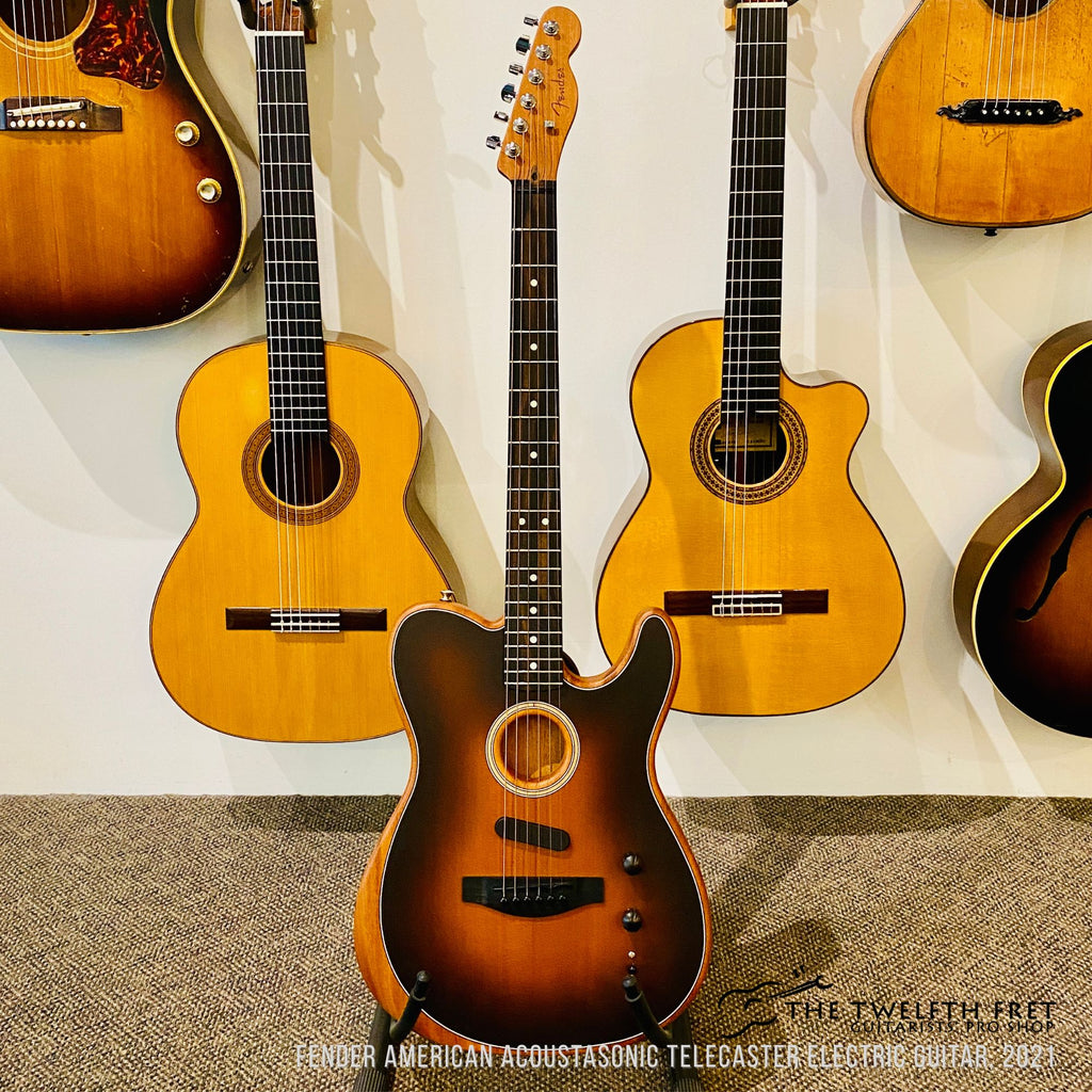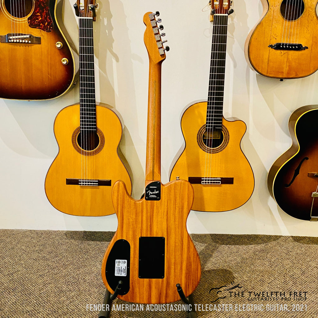 Here is a Fender American Acoustasonic Telecaster from 2021. This guitar is a hybrid acoustic electric guitar for players that want one guitar to cover both acoustic and electric sounds for a gig. It features a mahogany body and neck with a waterfall sound post design. The forearm contour provides the player with a more ergonomic playing experience.