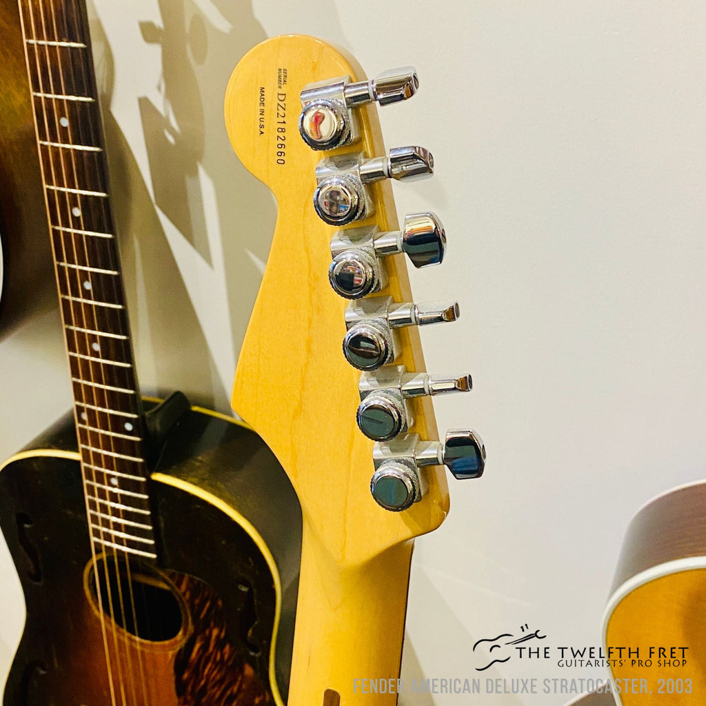Here is a Fender American Deluxe Stratocaster from 2003, finished in Aged Cherry Burst. The neck has a modern “C” shape with 22 medium-jumbo frets, making it comfortable and easy to play.