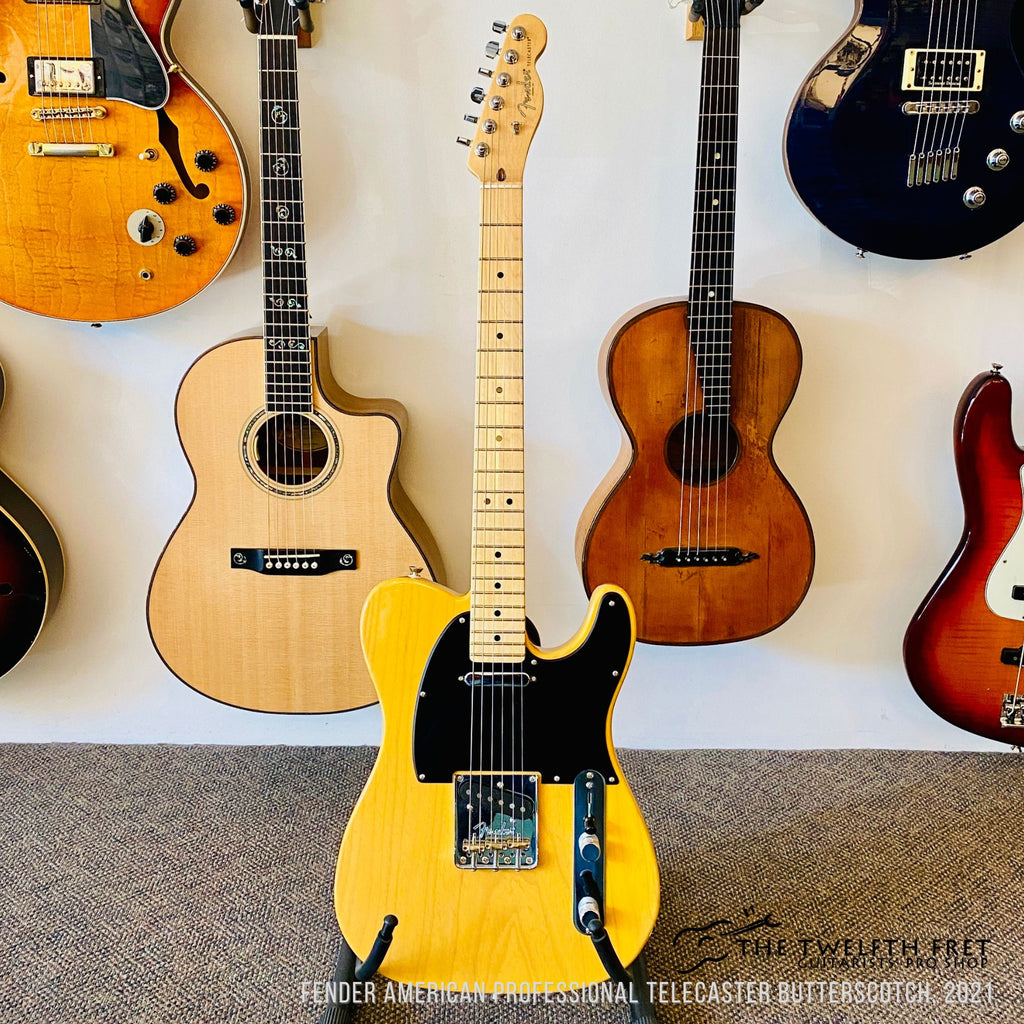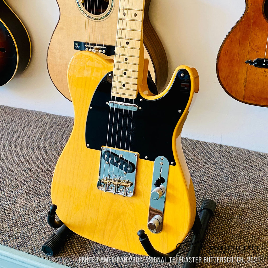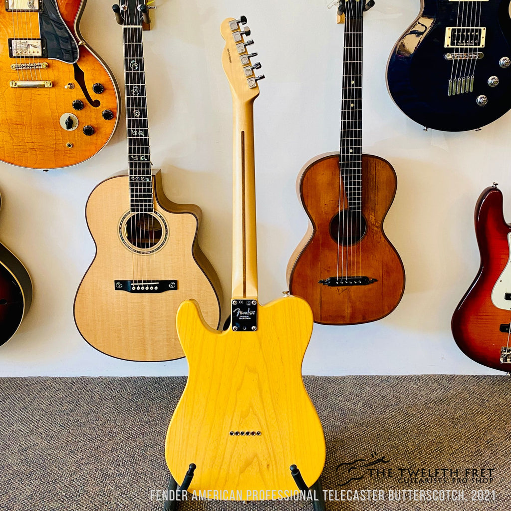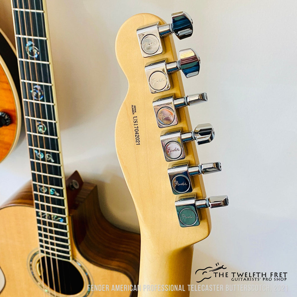 Here is a Fender American Professional Telecaster from 2021, solidly built, using premium materials and hardware, with a butterscotch polyurethane finish, giving it a warm, classic look.