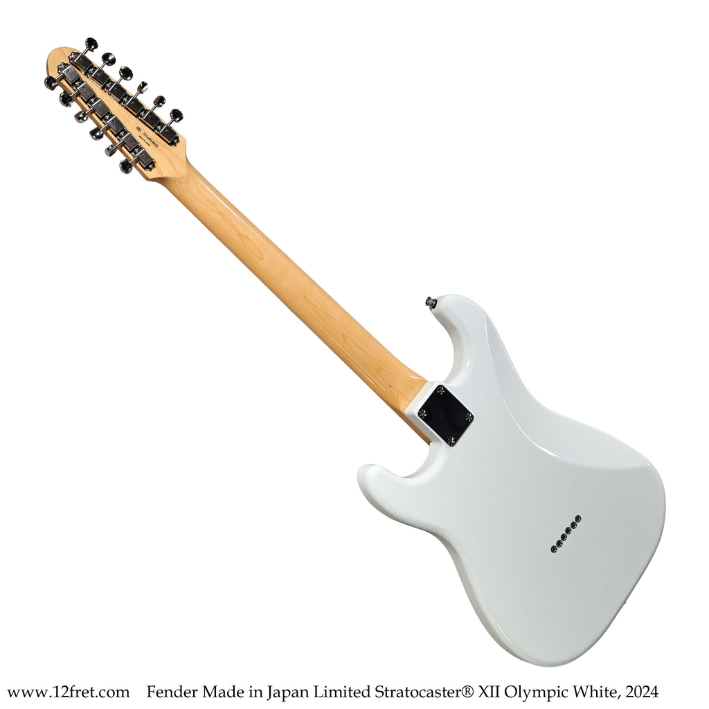 The Made in Japan Limited Stratocaster® XII pairs an Alder body with a standard 9.5 inch radius Maple neck with slab-style Indian Rosewood fingerboard and 21 Marrow-Tall frets. This neck has the truss rod adjustment at the 'traditional' body end, so the pickguard or neck must be removed for adjustment. The "U" neck profile is a bit thicker than a standard six-string Stratocaster to provide extra stability under the increased tension. The headstock is naturally altered to accept two rows of six tuners. There is also a bar with six holes to replace sets of string trees.