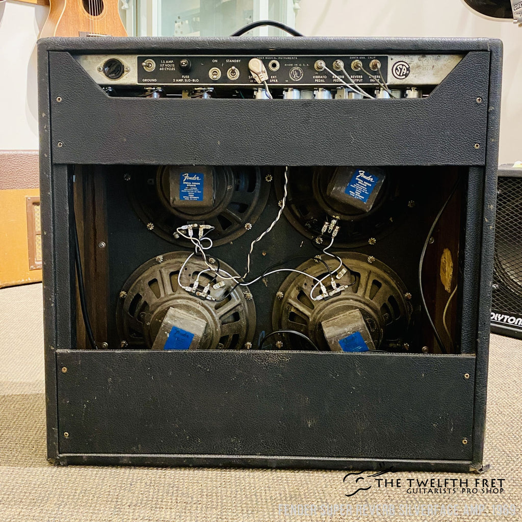Here is a Fender Super Reverb Silverface Amp from 1969. At some point in the life of this amp it had been converted to a solid state but has since been converted back to a Super Reverb Blackface circuit. It has a replacement mercury transformer and the original Fender Design 4 x 10" speakers.