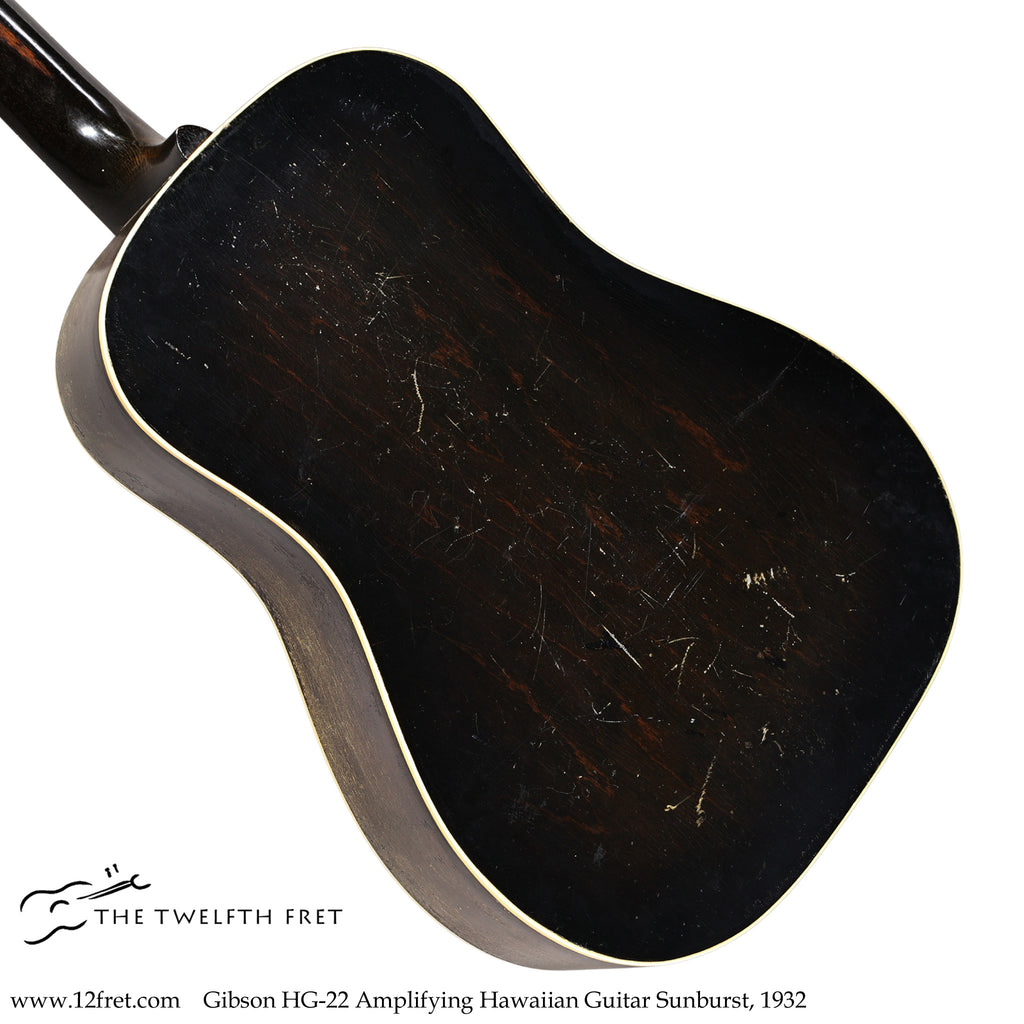 This rare Gibson HG-22 Amplifying Hawaiian Guitar dates to 1932 based on its Factory Order Number (FON), an ink stamp visible looking through the soundhole towards the neck block and used in place of a serial number.