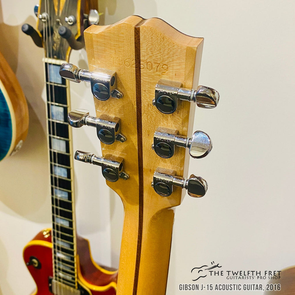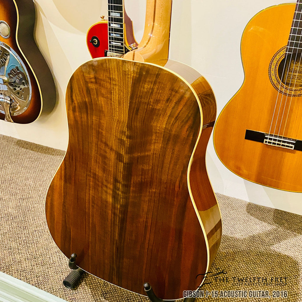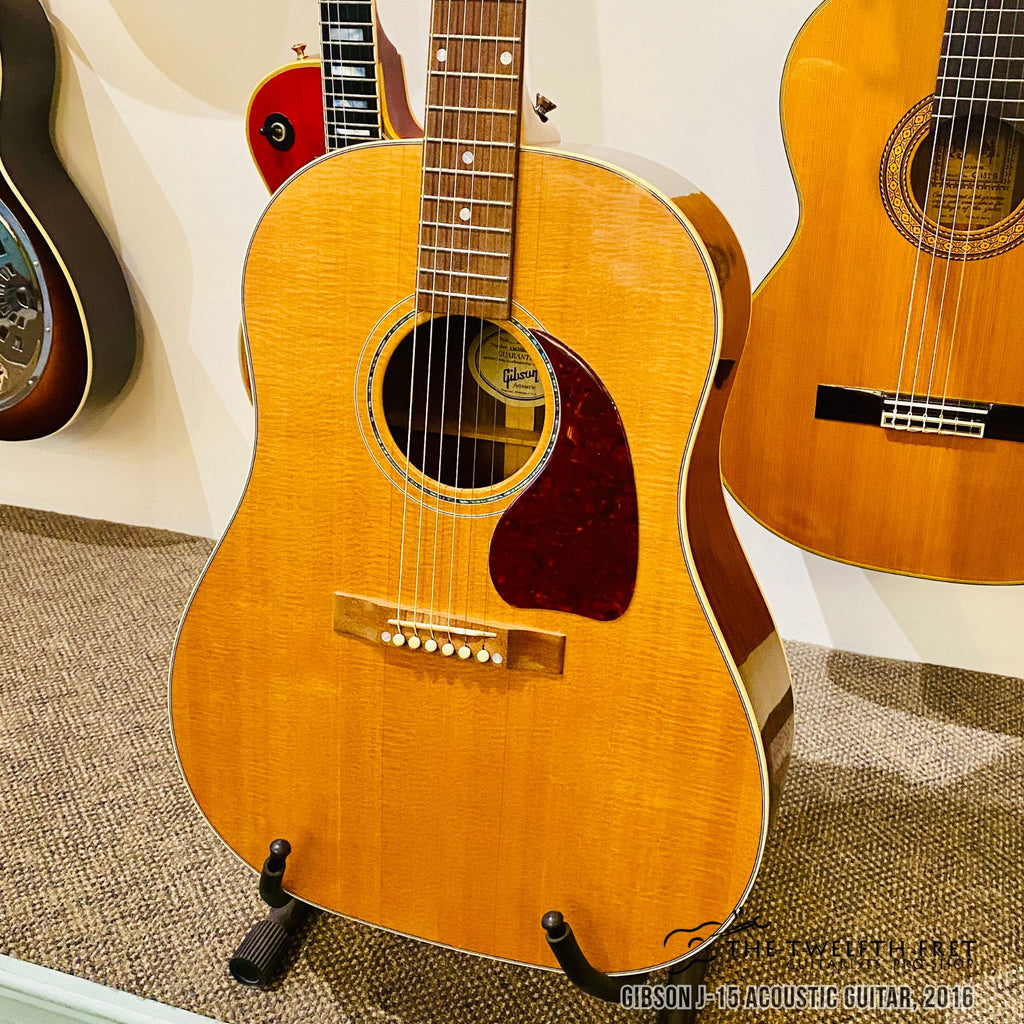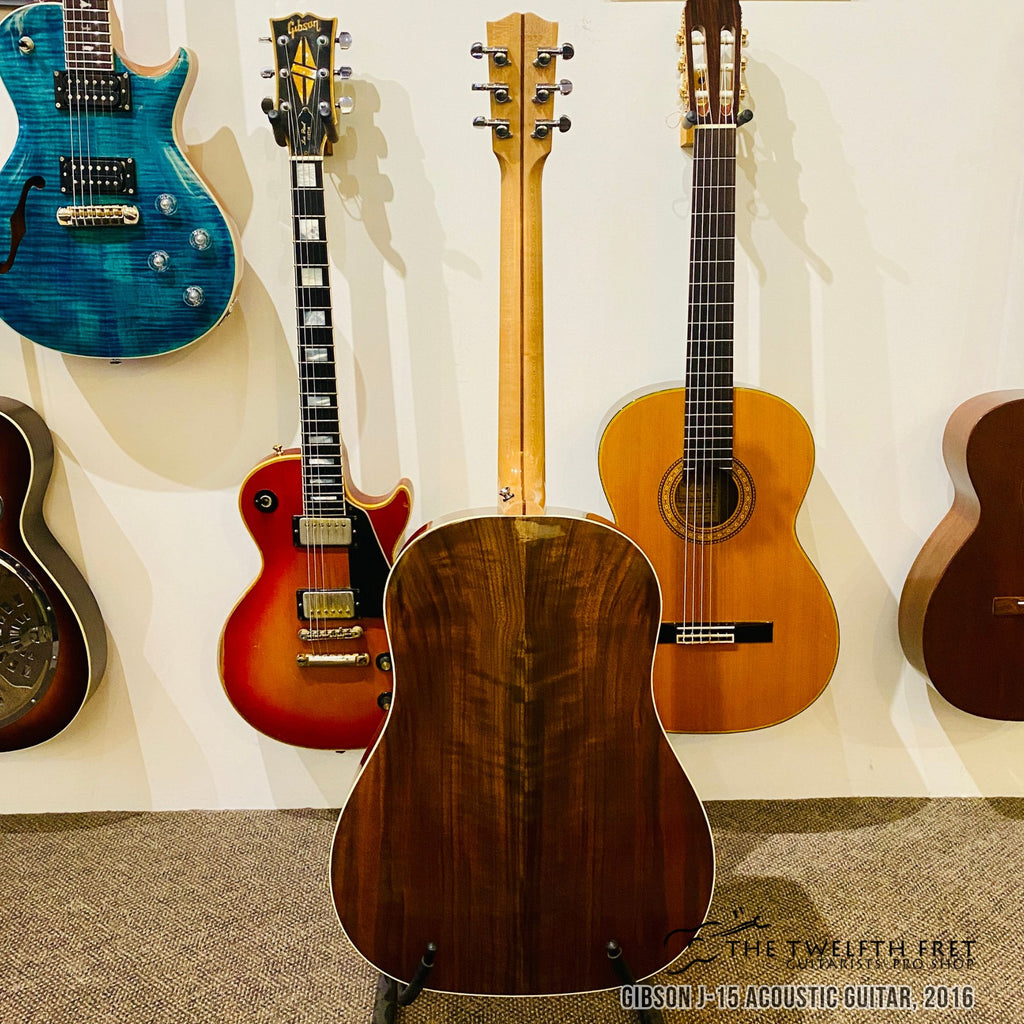 Here is a Gibson J-15 Acoustic Guitar from 2016. This guitar features a Sitka spruce top and Walnut sides and back. This wood combination on a slope shoulder guitar produces a warm midrange forward tone with a good amount of volume.