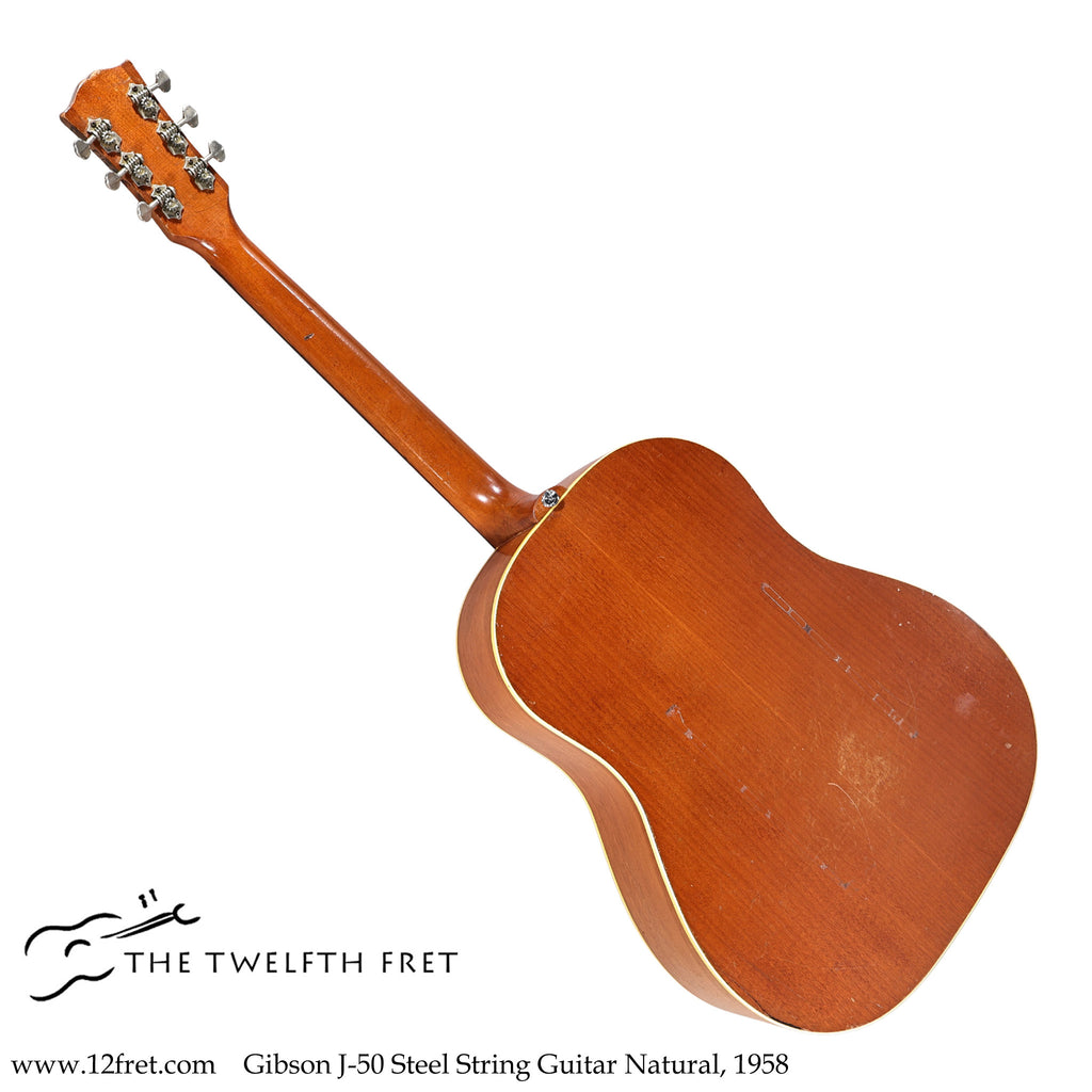 Shown here is a Gibson J-50 steel string guitar, slope shoulder dreadnought dating to 1958, and built at Gibson’s Kalamazoo, Michigan plant.