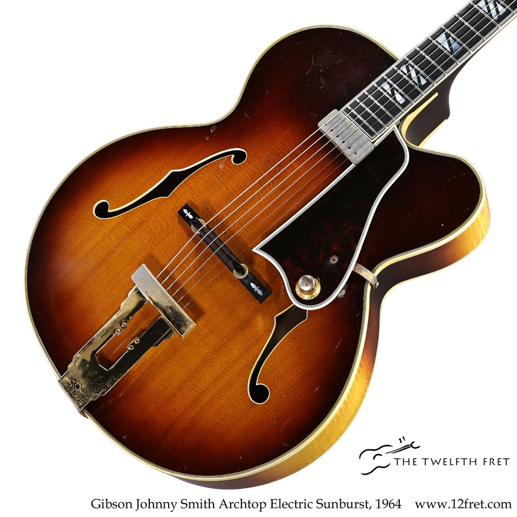This Gibson Johnny Smith archtop electric guitar dates to 1964 and is in largely original and good working condition. The orange label includes the term 'Union Made', which first started to appear in 1964 and was used until about 1969.
