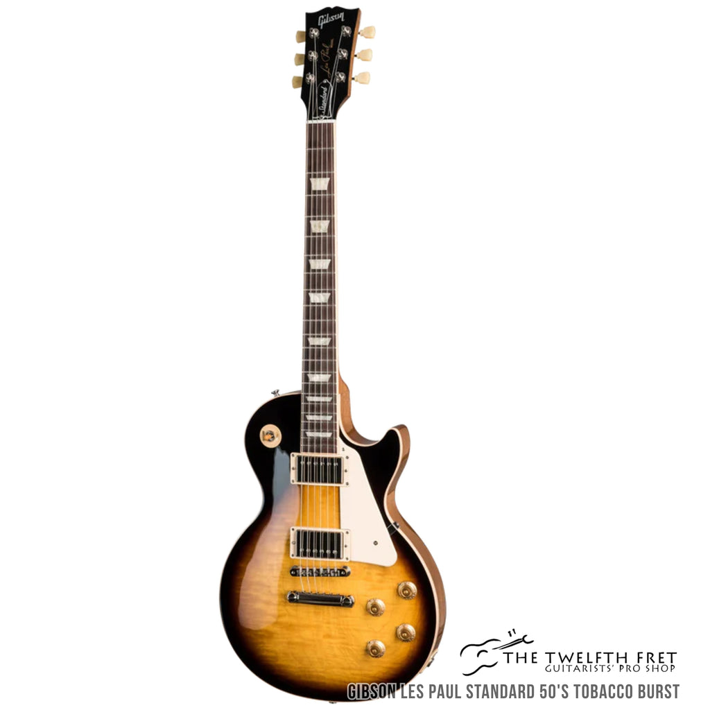 Expertly crafted with precision and quality, the Gibson Les Paul Standard 50's Tobacco Burst electric guitar boasts a solid mahogany body and maple top. Its rounded 50's-style mahogany neck features a sleek rosewood fingerboard adorned with trapezoid inlays, making this instrument a true standout in both form and function.