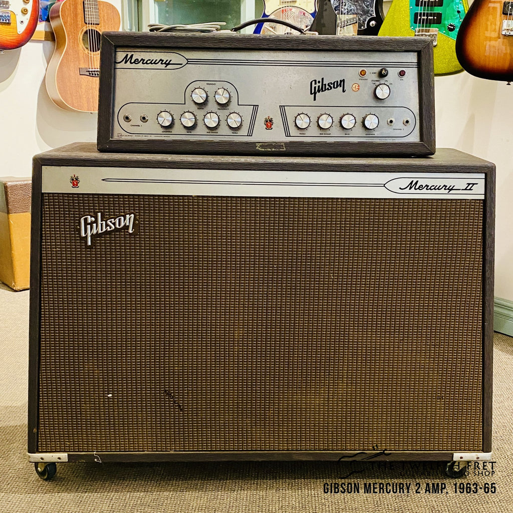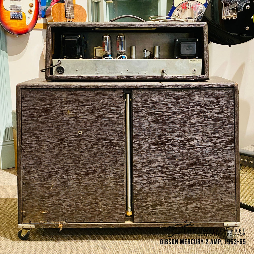 Here is a Gibson Mercury 2 Amp made between 1963-1965. This Gibson amp puts out 35 watts through a speaker cab with both a 10" and 15" speakers. It has two channels and a tremolo circuit. It is running on 2 x 6L6 power tubes and the tone is full and clean until you run the amp very loud then it starts to break up a bit.