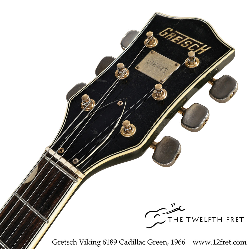This Gretsch Viking 6189 in Cadillac Green with Jimmy Webster tailpiece has Serial number 126136. This dates it to December 1966 at Brooklyn, just as the sale to Baldwin was being worked out for completion on July 31 1967. During 1969, Baldwin moved production to Booneville, Arkansas. In 1973, devastating fires caused Gretsch guitar production to temporarily end, though drum production was moved to DeQueen, Arkansas.
