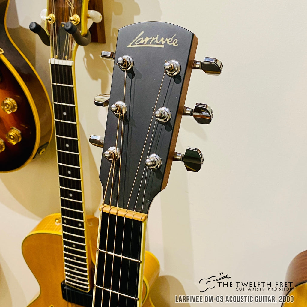 This Larrivee OM-03 is in good overall condition with some minor scratches on the top. The binding on the treble side of the neck tag is starting to separate.