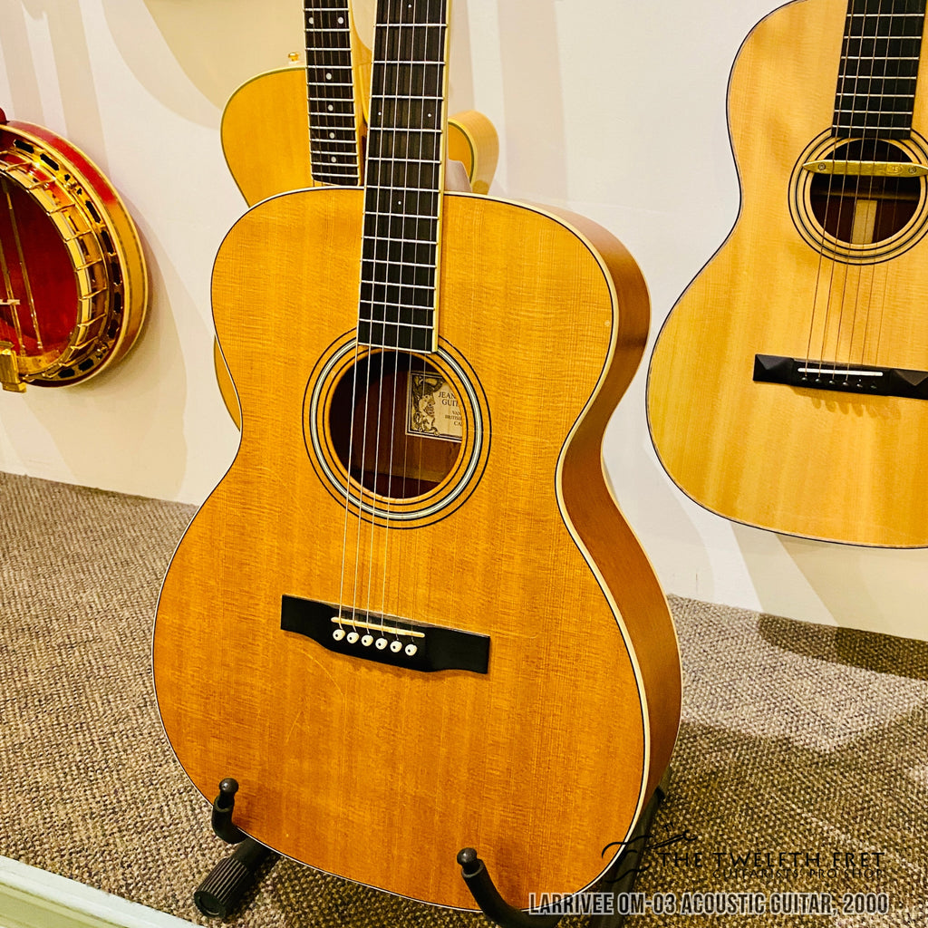 Here is a Larrivee OM-03 Acoustic Guitar from 2000. The OM size body provides a well balanced tone and very comfortable playing experience with its smaller lower bout width and curved waist.