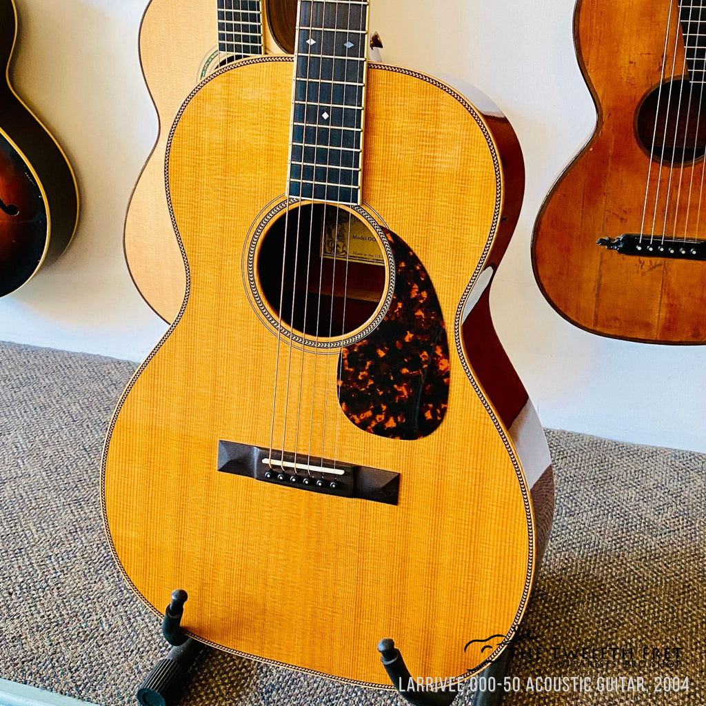 This Larrivee OOO‑50 acoustic guitar from 2004 is a beautifully balanced high-end acoustic guitar that blends refined aesthetics and superb tonal flexibility. It is constructed with all-solid tonewoods; a sitka spruce top, mahogany back and sides, ebony fingerboard and bridge. Underneath, it has Larrivee's symmetric, parabolic X-bracing pattern giving it a wide dynamic range and balanced voice.