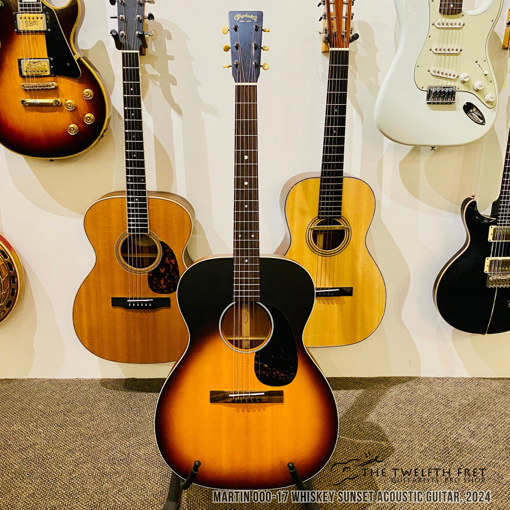 Here is a Martin 000-17 Whiskey Sunset Acoustic Guitar from 2024. This small sized body acoustic features a spruce top with mahogany sides and back and a lovely whiskey sunset satin finish. The tone is warm and balanced and the satin neck finish provides a comfortable playing experience.