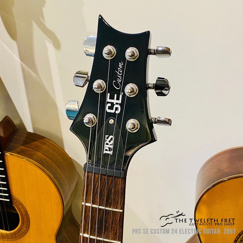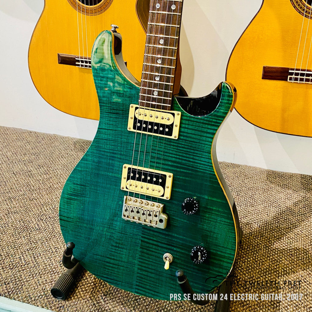 Here is a PRS SE Custom 24 Electric Guitar from 2007. This Korean made guitar from PRS features a trans green finish over a flame maple veneer. It features a double humbucker configuration with three way toggle switch, volume and tone setup that works for a large variety of styles.