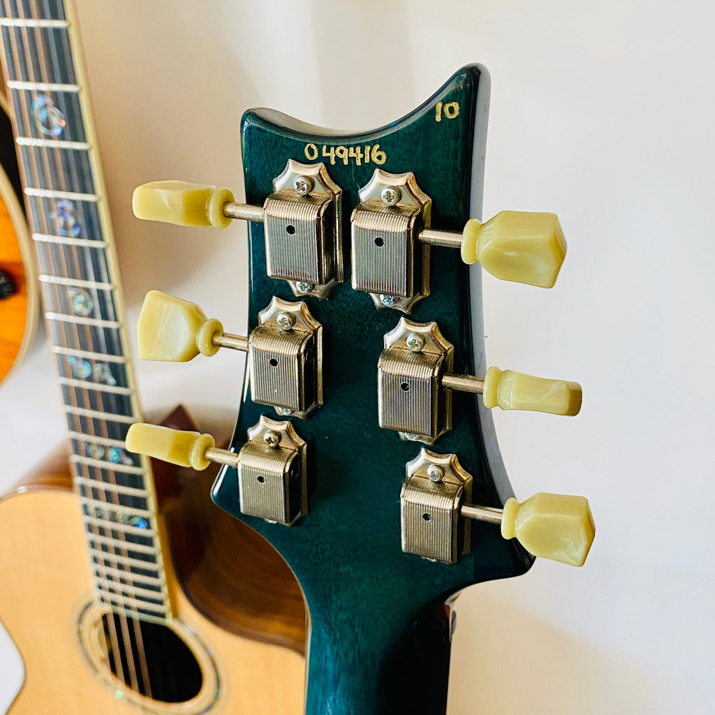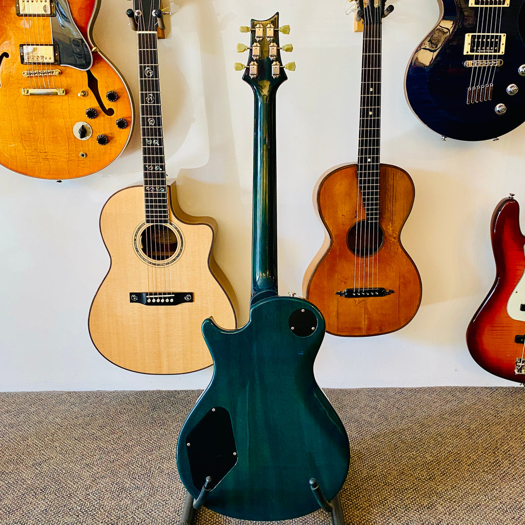 This particular example is finished in a vibrant trans green flame gloss. “10 top” refers to the premium-grade solid carved maple used in its construction. This premium flame maple top is one of its standout features, adding visual depth and brightness to the tonal character.