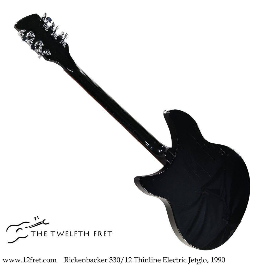 This Rickenbacker 330/12 Thinline Electric in Jetglo finish (gloss black) dates to January of 1990 and is in overall good condition with light fret wear and light finish wear with some checking. Recently set up, it plays very well and delivers the distinctive shimmering Rickenbacker jangle.
