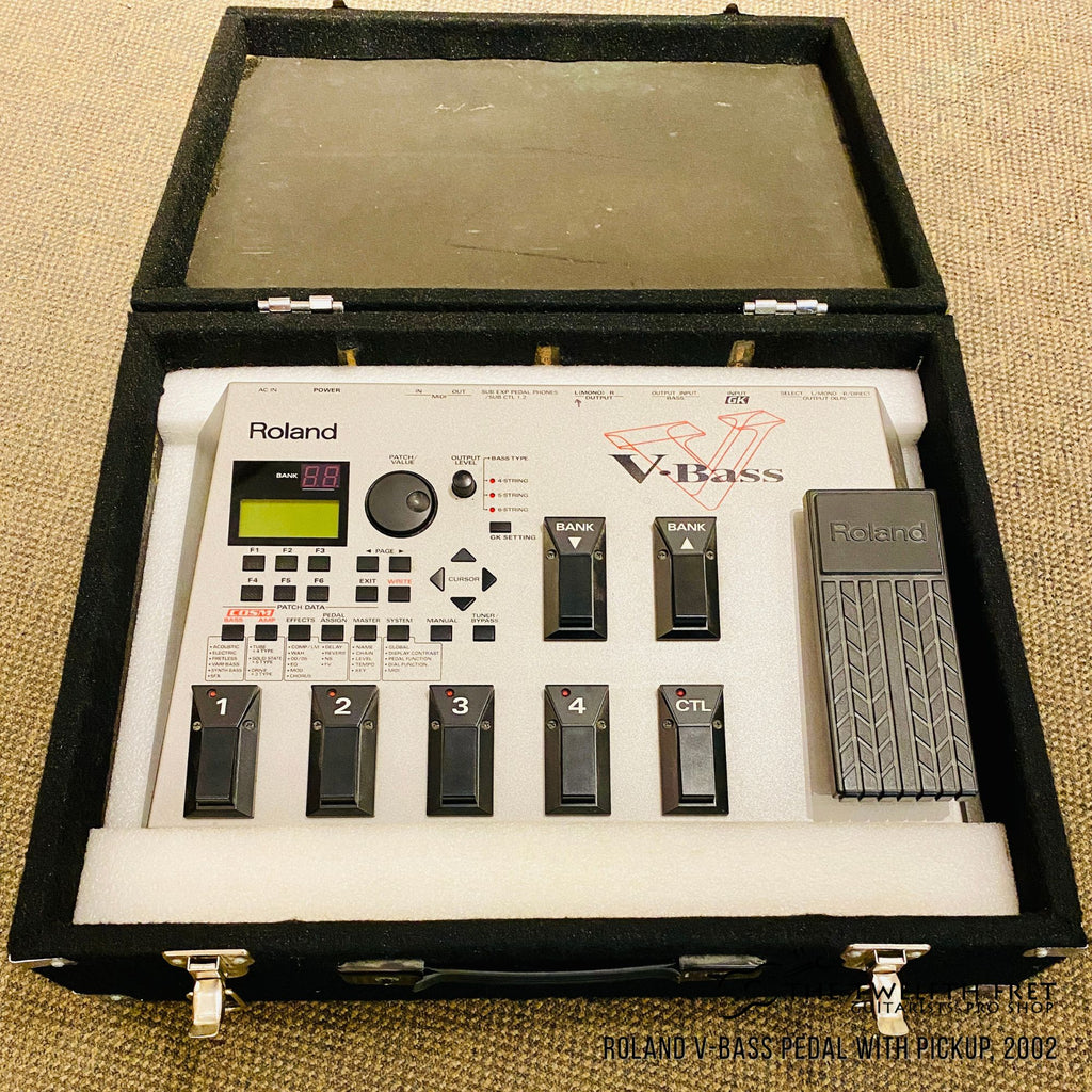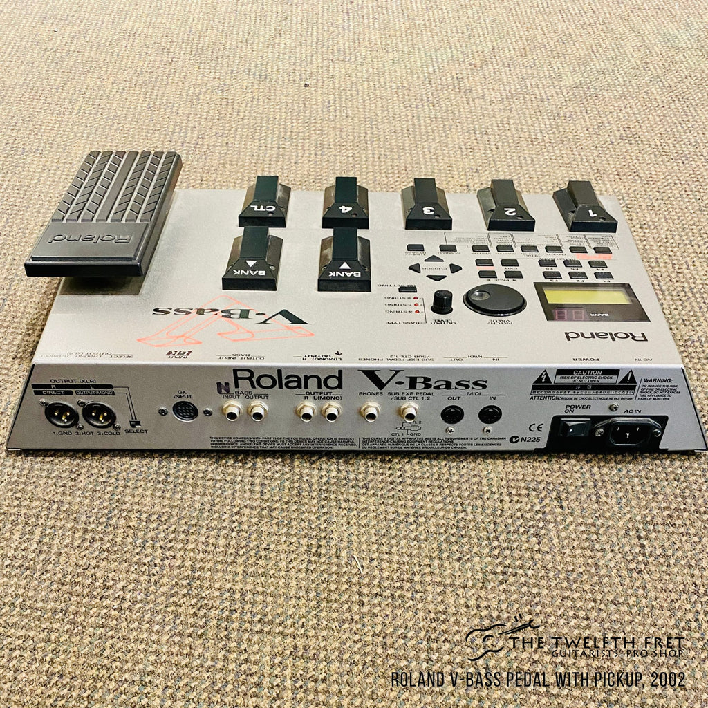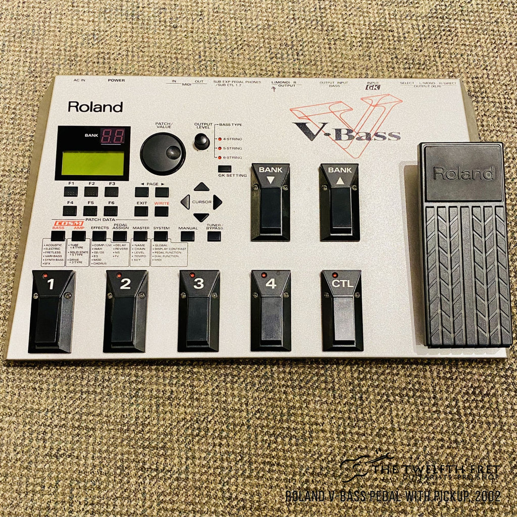Here is a Roland V-Bass Pedal with Pickup from 2002. The V-Bass system is a processor that replicates classic basses, bass amps and multiple polyphonic bass specific effects. The required GK-3B pickup is included along with the pedal as well as the GK 13 pin and 1/4" stereo cables.