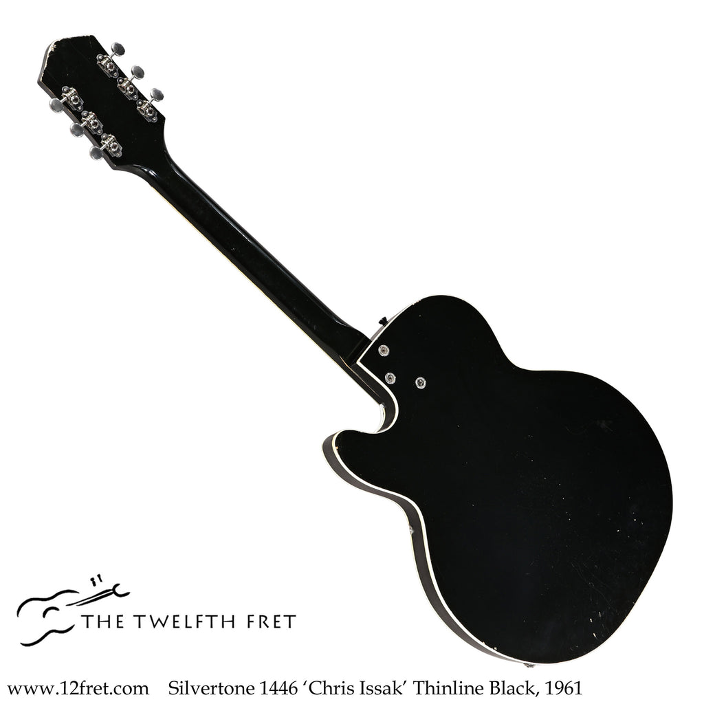 The fully hollow guitar shown here, produced from 1961 to 1967, is commonly referred to as the Silvertone 1446 'Chris Issak' model because Issak posed with one for the cover of his 1985 first album, also titled 'Silvertone'. The 1446 replaced the Harmony 'Espanada' and re-branded versions of that guitar.