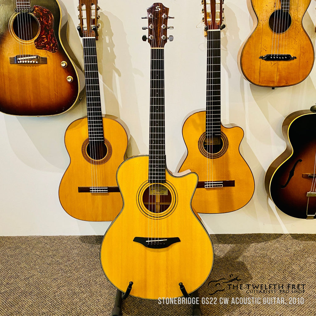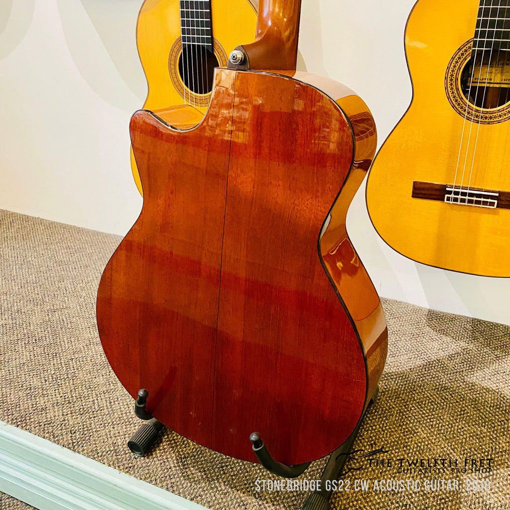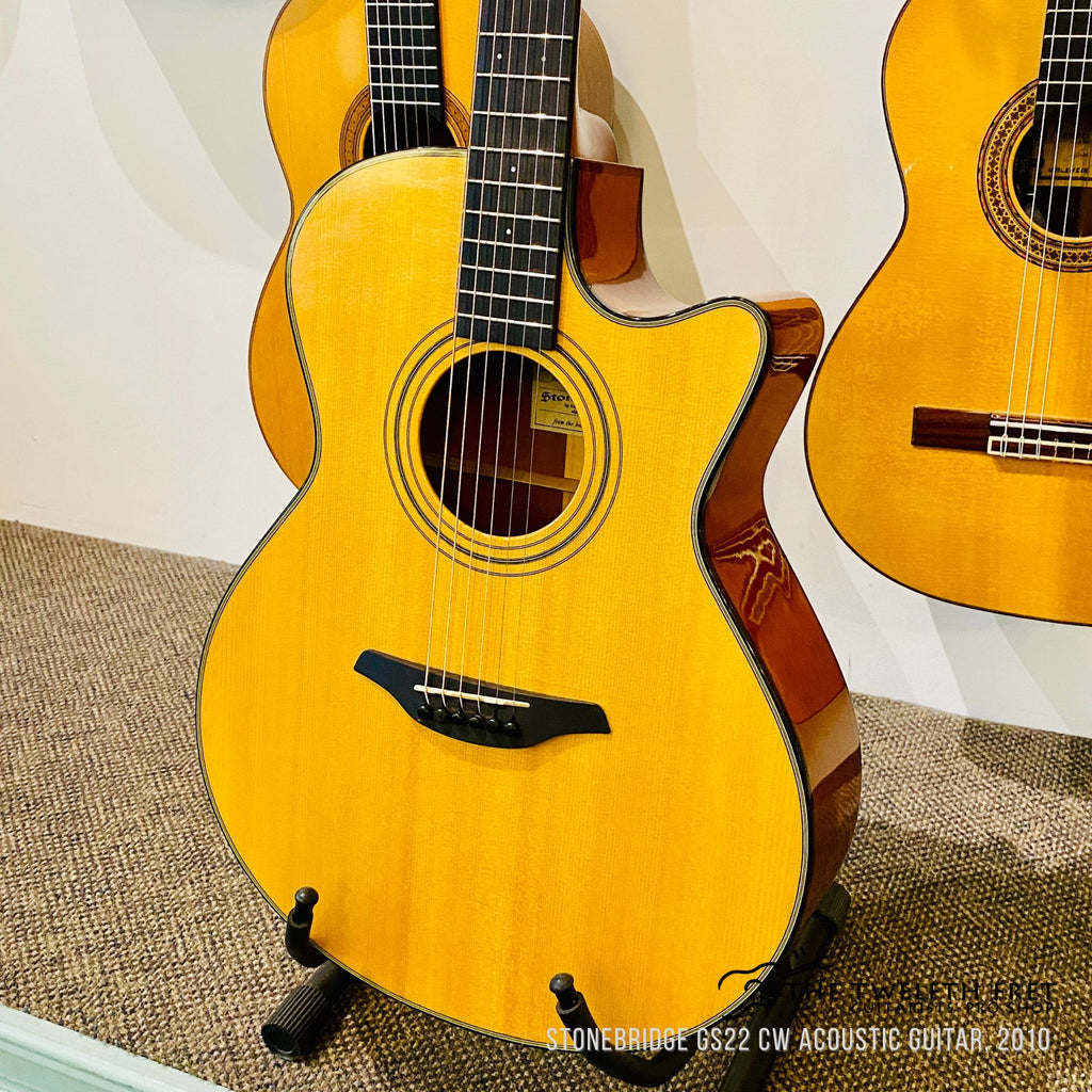 Here is a Stonebridge GS22 CW Acoustic Guitar, 2010. This concert sized body shape features a Sitka spruce top and mahogany back and sides for a warm midrange focused tone.