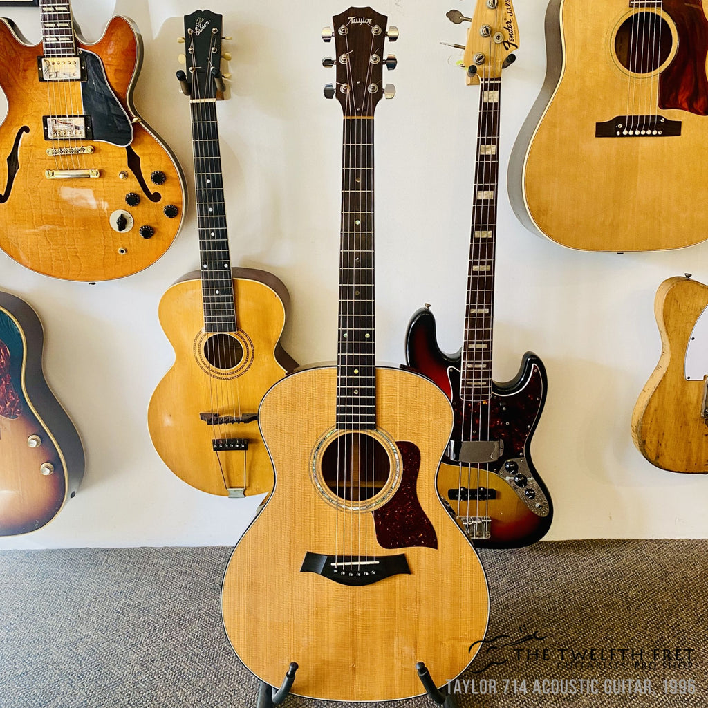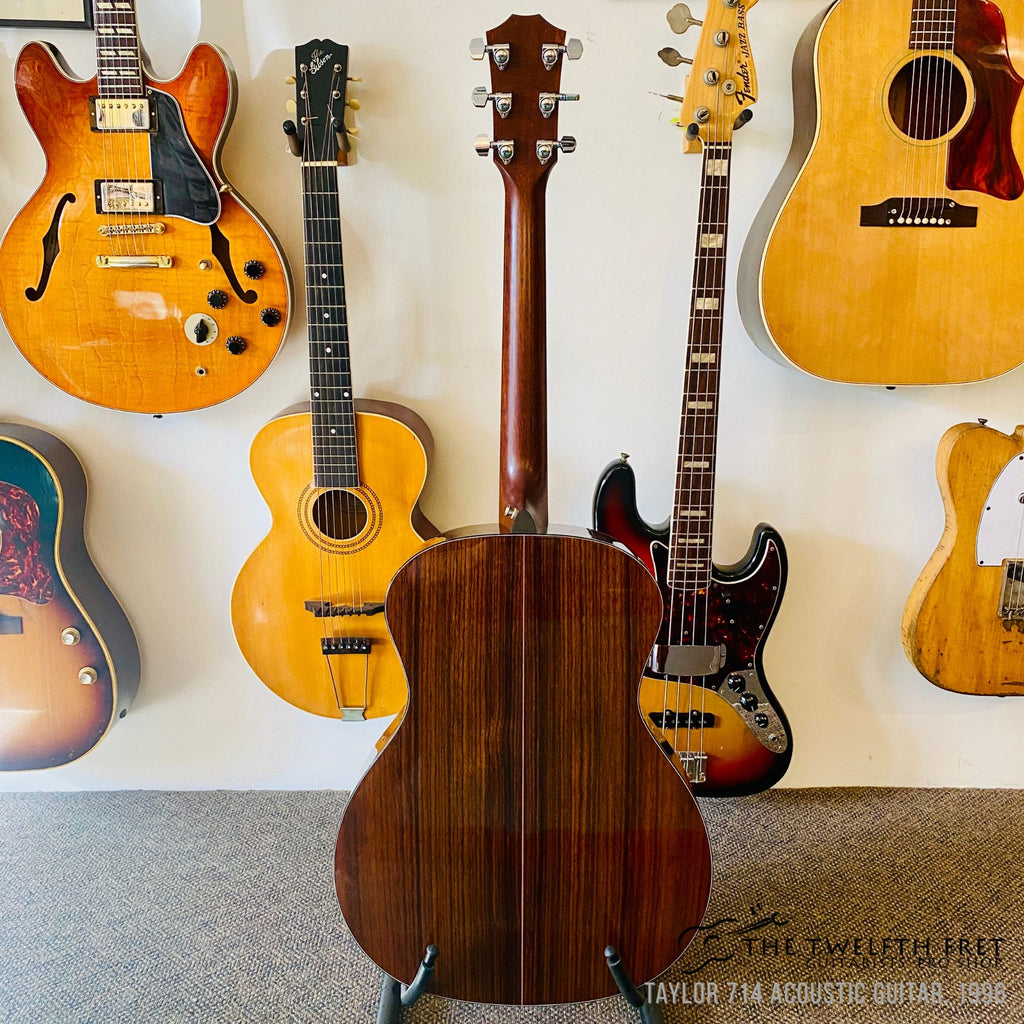 This Taylor 714 Acoustic Guitar from 1996 is part of Taylor's 700 Series. It has a solid Sitka spruce top and solid Indian rosewood back and sides, giving it a rich, clear tone with warm lows and bright highs.