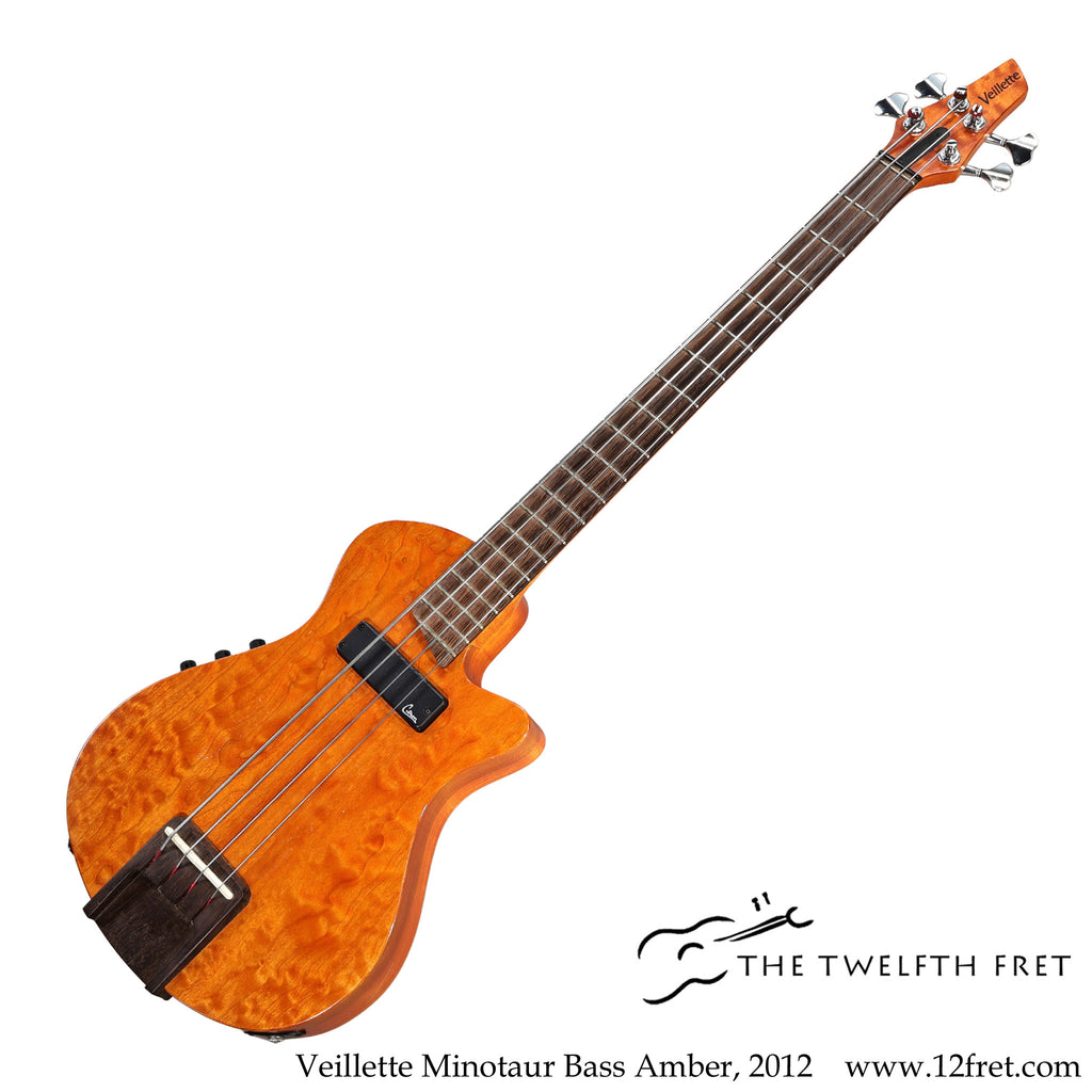 The Veillette Minotaur Bass is a low production short scale bass built in Woodstock, NY, this example dating to 2012 and still in the catalog, though current versions use a different bridge and tailpiece setup. Veillette's history is interesting and involves a number of figures deeply involved in the development of modern American guitar culture.